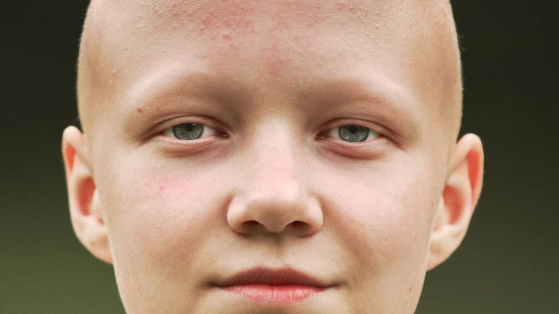 Close up of a person who doesn’t have eyebrow or eyelash hairs