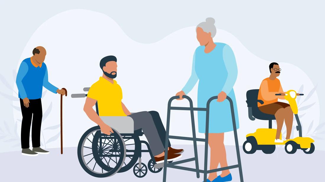 People using different mobility aids; walker, scooter, wheelchair and cane