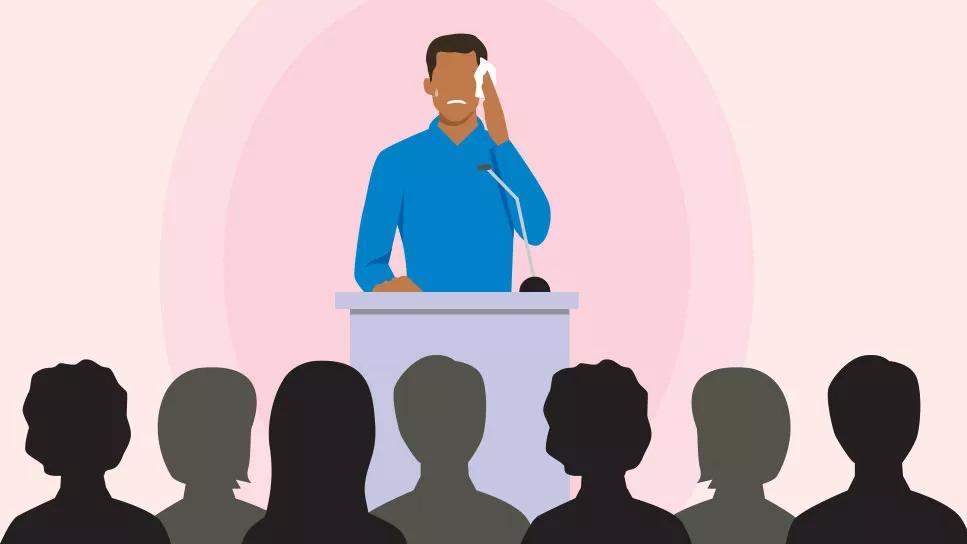 Person at podium in front of crowd, nervous, sweating