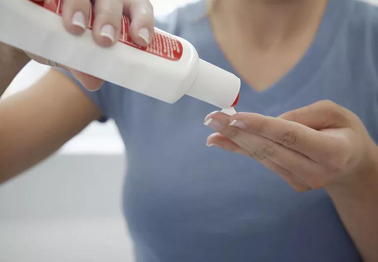 Person applying sunscreen.