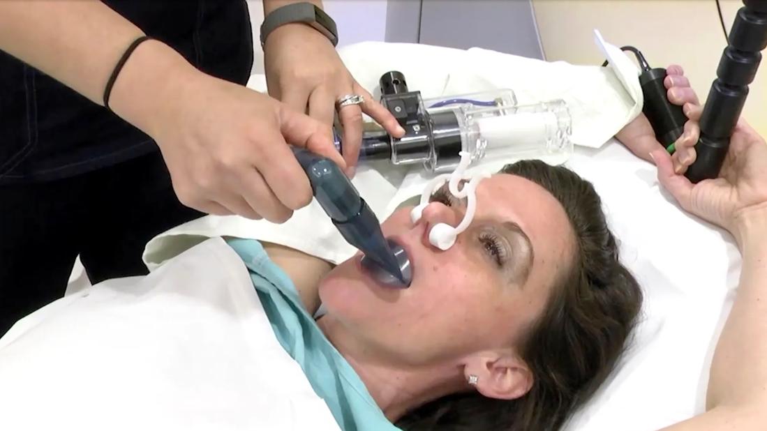 An ABC looks like a snorkel with a nose clip. You’ll also hold on to a handheld element of the device, which has a button on top. It’s connected to a computer that’s monitored by a therapist from your care team.