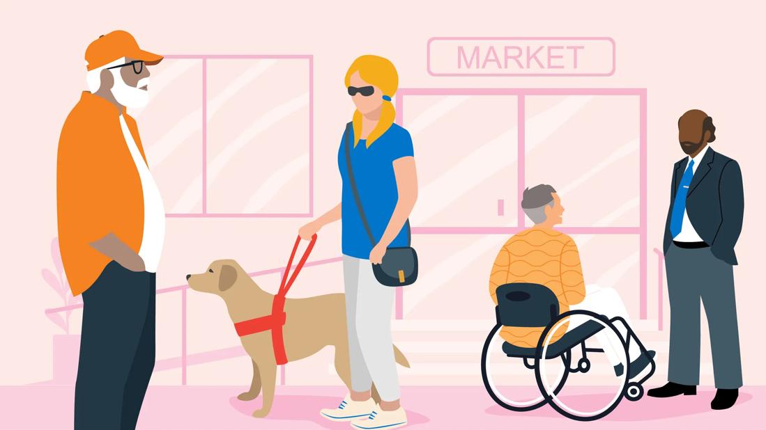 People with and people seemingly without disabilities outside a market store