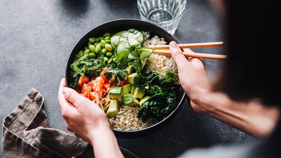Person about to eat a bowl of rice and mixed veggies, including edamame, sprouts and avocados