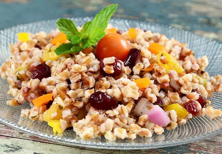 Wheat berries are not really berries at all, but are the whole-grain form of wheat, much like a kernel of rice. They’re nutrition-packed because the kernel is left intact. Wheat berries impart a pleasant, chewy texture and nutty flavor and won’t turn into mush when mixed with a dressing or moist fruits or vegetables. This delicious salad is vegan-friendly, too!