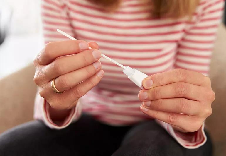 The at-home DNA test doesn’t need a prescription, can be ordered online and requires submitting a saliva sample. A lab analyzes DNA from cells in your saliva to look for three pathogenic variants in the BRCA genes (two in BRCA1 and one in BRCA2).