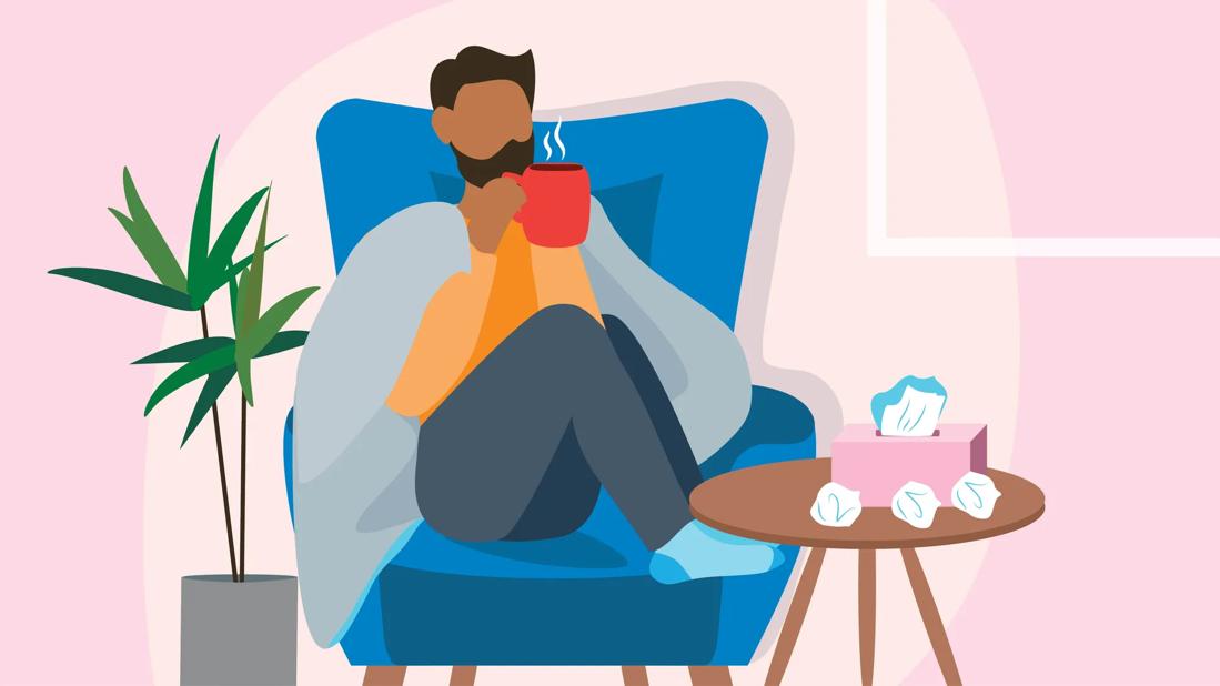 Person bundled up in a chair, sipping a warm beverage, with box of tissues and used tissues on nearby table