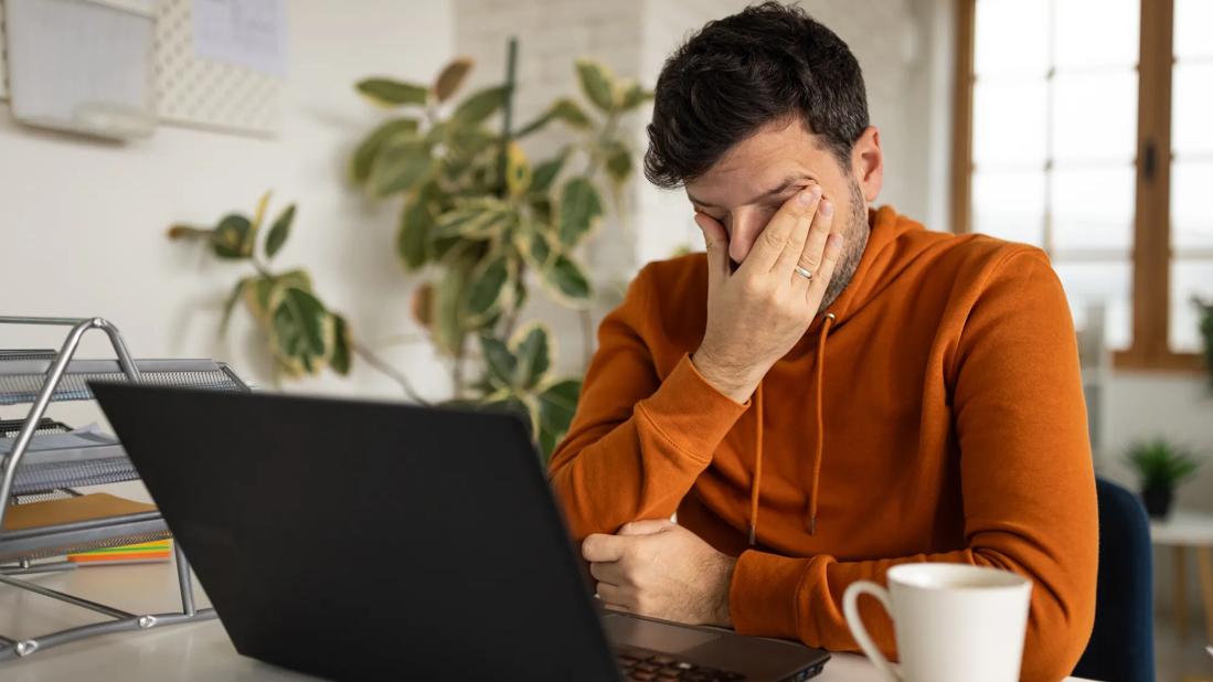 Tired person sitting at their laptop with hand rubbing their eyes, with cup of coffee nearby