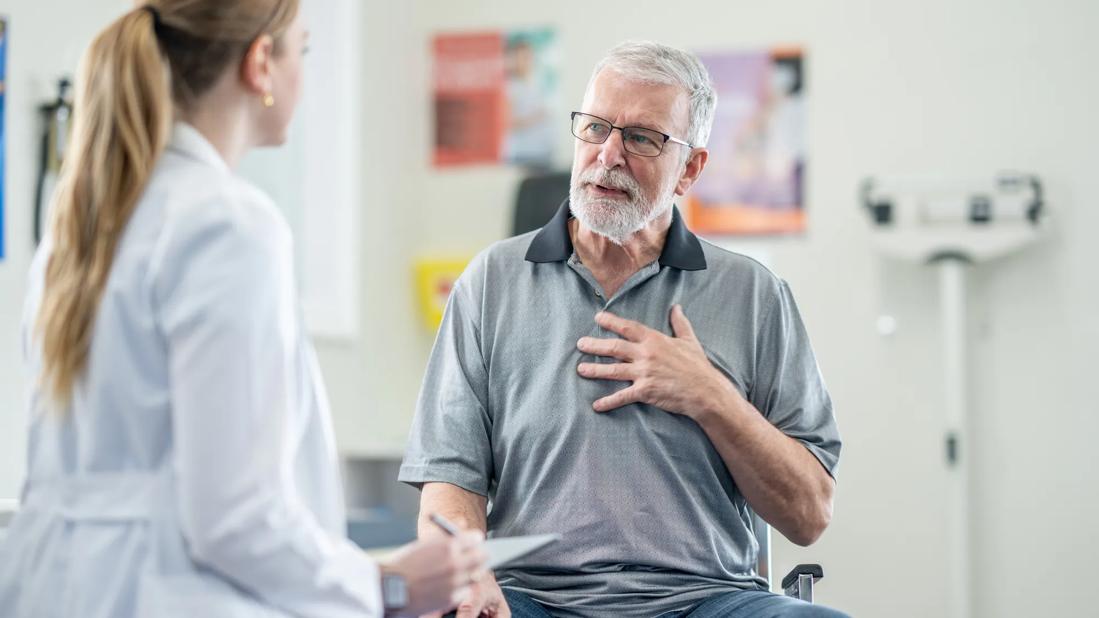 Older man with hand on chest while talking with healthcare provider in exam room