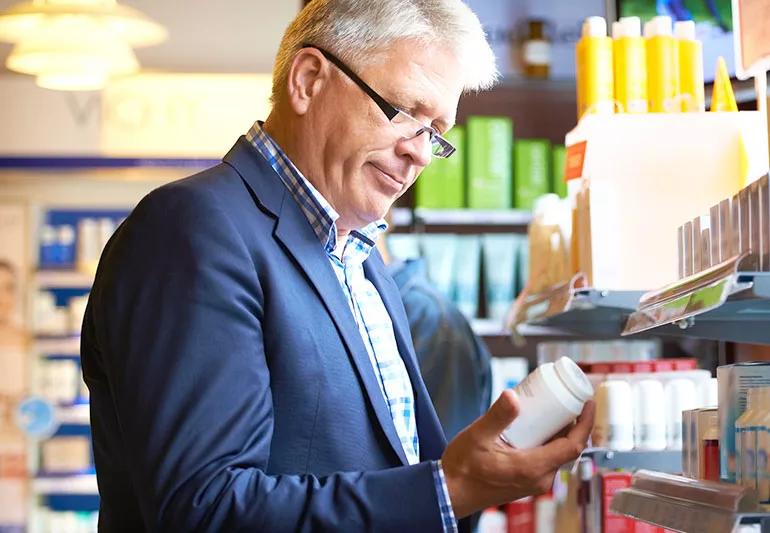 Elderly person shops for supplement at drug store.