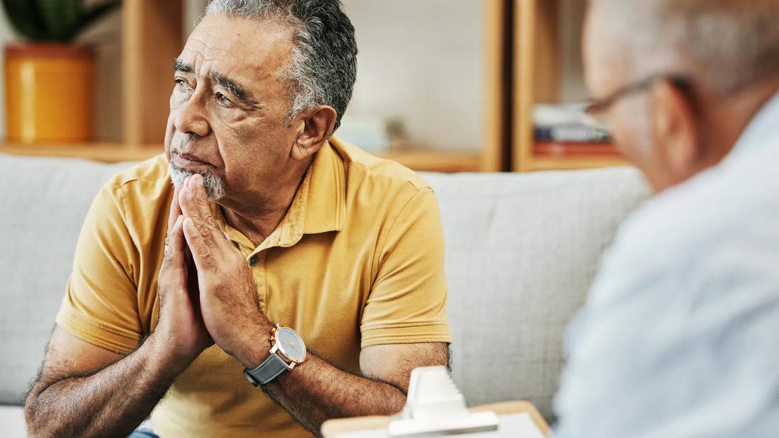Older male sitting on couch, looking reflectively away, across from healthcare provider