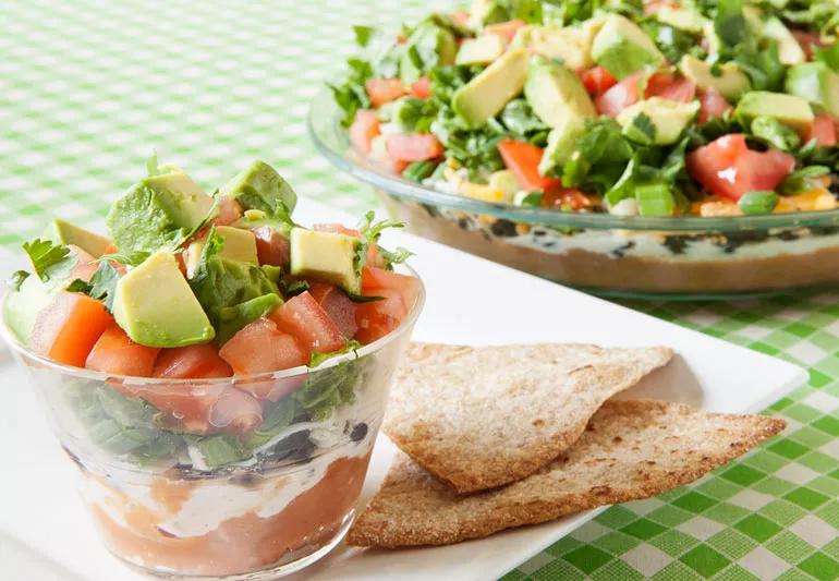Note: Feel free to add a layer of lean ground beef, ground turkey, chicken breast or veggie crumble. If so, cook the meat or meat substitute and add 1/2 packet of taco seasoning, then layer on top of refried beans.