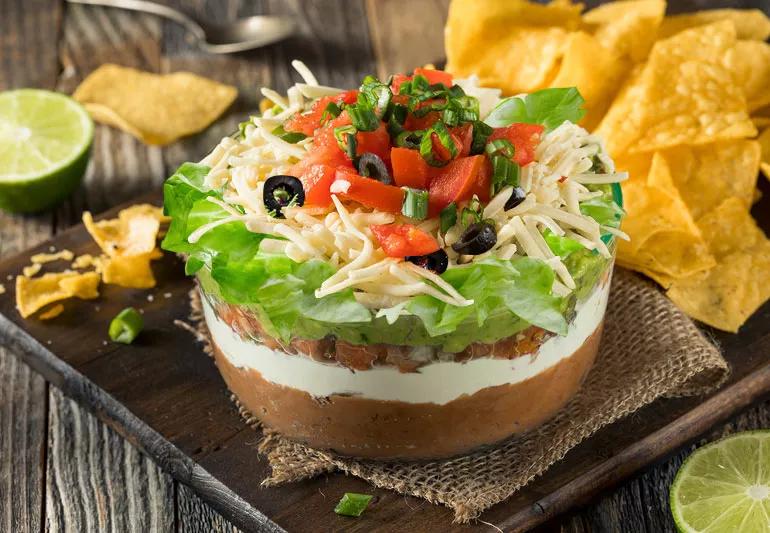 This eight-layer Mexican fiesta dip is truly a party in your mouth. It’s healthy, big on ingredients and flavor, and so easy to make. Scoop it up with baked tortilla chips or layer it onto a whole-grain tortilla or wrap. Enjoy!