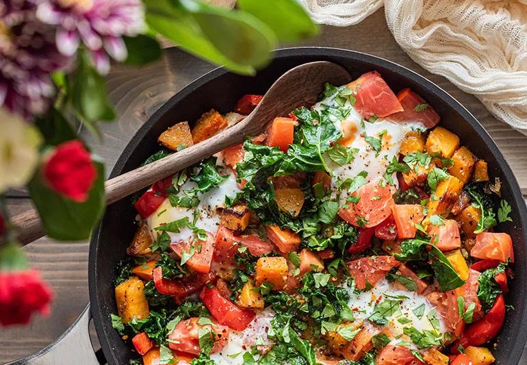 A pan of butternut squash mixed with tomatoes, eggs and green herbs