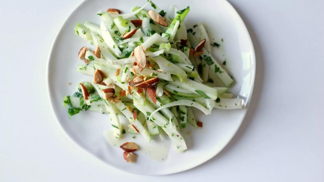 Wow your friends and family with this festival of flavor and texture. The tart Granny Smith apples, sweet fennel bulb and fresh herbs, topped with crunchy almonds and a creamy sweet-and-sour dressing, provide plenty of plant nutrients and good fats.