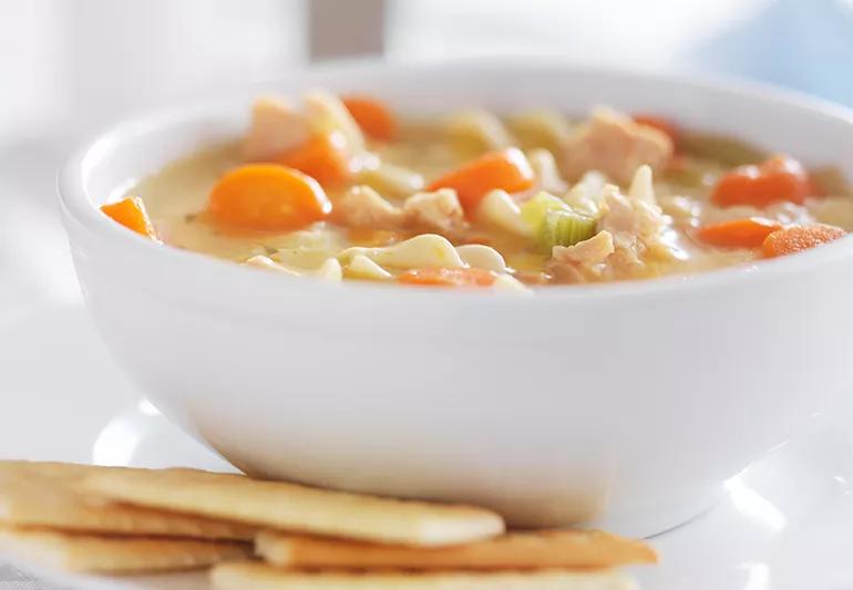 This chicken noodle soup uses yolk-free noodles that are made with whole grains. Loaded with vegetables, this comfort-in-a-bowl contains no-salt added chicken stock to keep sodium levels low. It’s perfect for when you’re caring for someone with a cold or the flu, or anytime you need some comfort food!