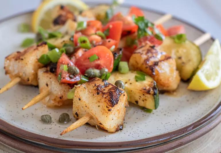 Fish kabobs on plate with lemon, tomato and capers