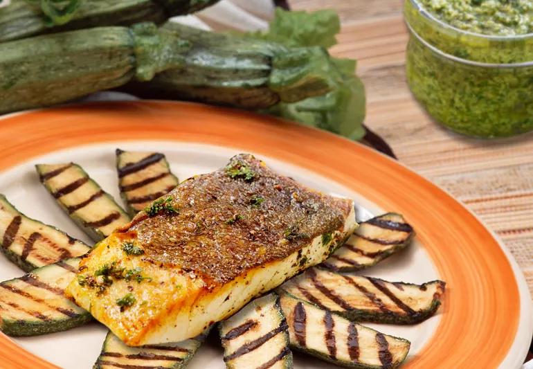 Thick-cut halibut and thinly sliced zucchini strips are the heart of this meal, and they grill up in a snap. The easy-to-make salsa verde adds flavor galore, with basil, parsley, garlic, lemon and green olives. Put this simple, yet deliciously sophisticated dish in your regular rotation, and you’ll see smile after smile at your dinner table.