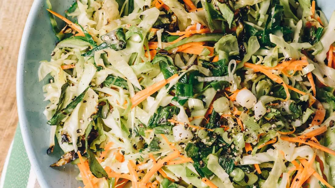 A few minutes on the grill imparts a smoky flavor to not just cabbage but also corn, poblano and red bell peppers. A light, glop-free vinaigrette adds tang, and cilantro and cumin add plant-powered punch. Bursting with nutrients, flavor, and crunch, this dish makes a perfect side for any backyard gathering or weeknight meal.