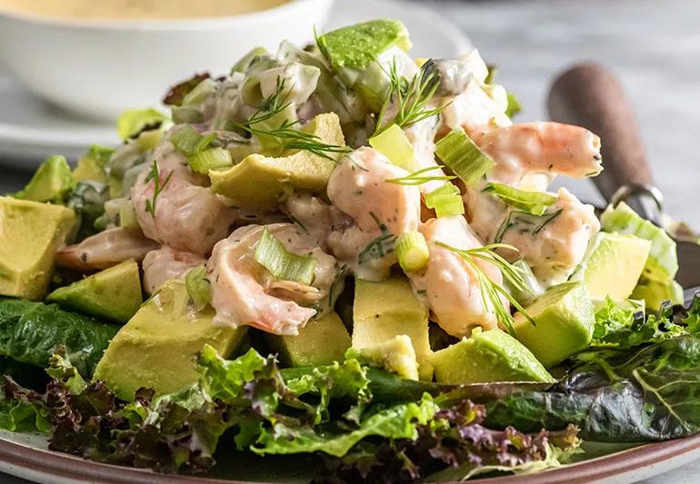 The classic flavor combination of bright lemon and refreshing dill make a creamy sauce for cooked shrimp, served over an avocado half with crisp greens. This salad can transport easily for lunch away from home, with the items packed separately and kept cold.