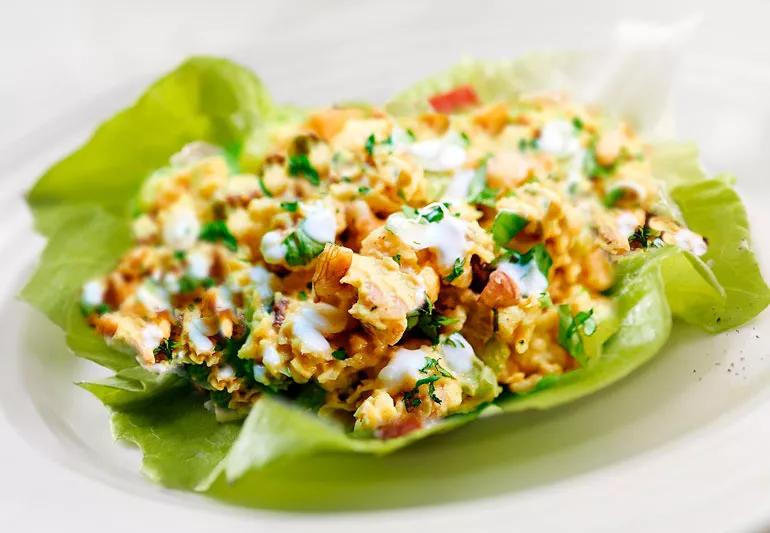 Try this vegetarian ‘chicken’ salad. Garbanzo beans offer the meat substitute and Greek yogurt gives this dish a creamy consistency. Blend up with chopped celery, walnuts and sweet dried cherries, then wrap in crispy lettuce.