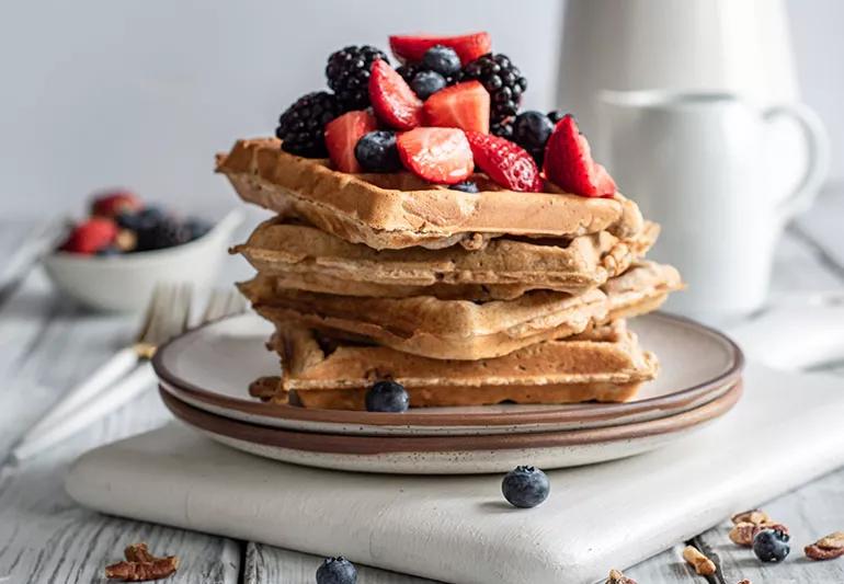 This versatile recipe for either waffles or pancakes is not just delicious but healthy too. Pecans offer antioxidants that may help promote heart health and are a rich source of vitamin E. By skipping the syrup and replacing it with fresh berries, this dish provides another source of powerful antioxidants, plus fiber!
