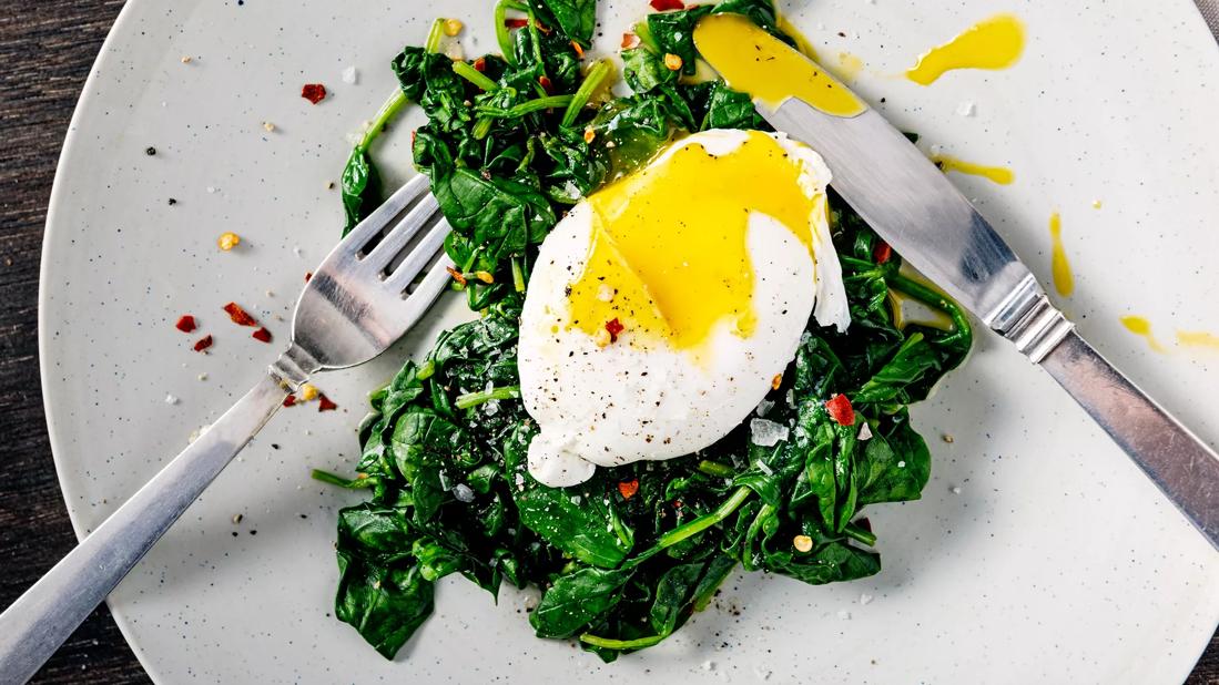 Start your day right with this light and tasty power breakfast. It offers a perfect balance of protein, greens and veggies — and the pesto gives it a little kick.