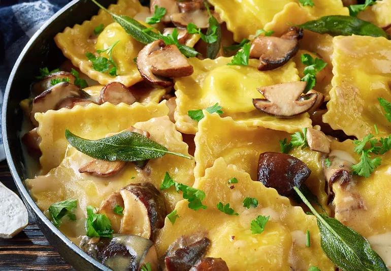Ravioli filled with this savory pumpkin mousse will delight your family and friends. A mix of wild mushrooms works wonderfully for the broth. Try thinly sliced cremini, shiitakes, chanterelles and morels. You can also use winter squashes or sweet potatoes for the filling.