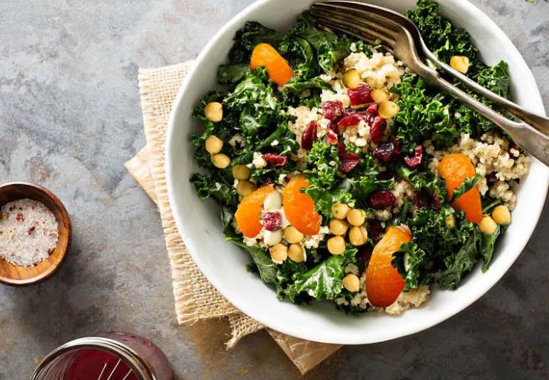 This vegan, gluten-free salad provides 100 percent of your daily vitamin A and 100 percent of your daily vitamin C. It’s also a good source of fiber, calcium and iron. Quinoa is a higher protein whole grain that cooks just like rice (2:1 water to grain ratio).