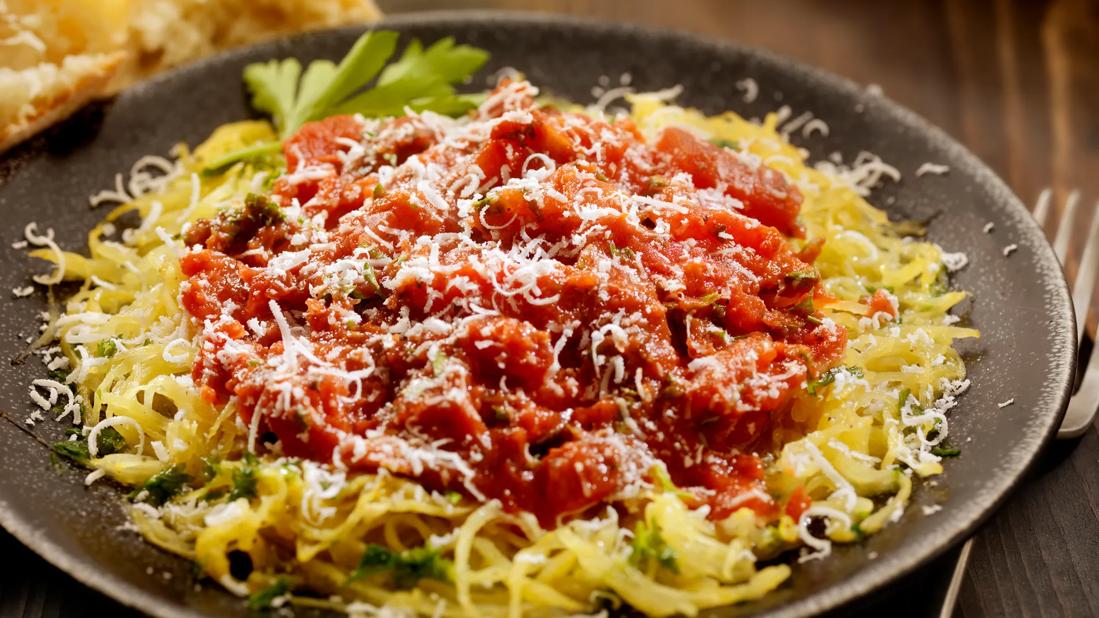 Surprise your family with this fun and delicious dish that boasts a secret ingredient: spaghetti squash. You’ll get more nutrition than you might believe possible from a “pasta” dish. Serve with grilled chicken and a tossed salad.