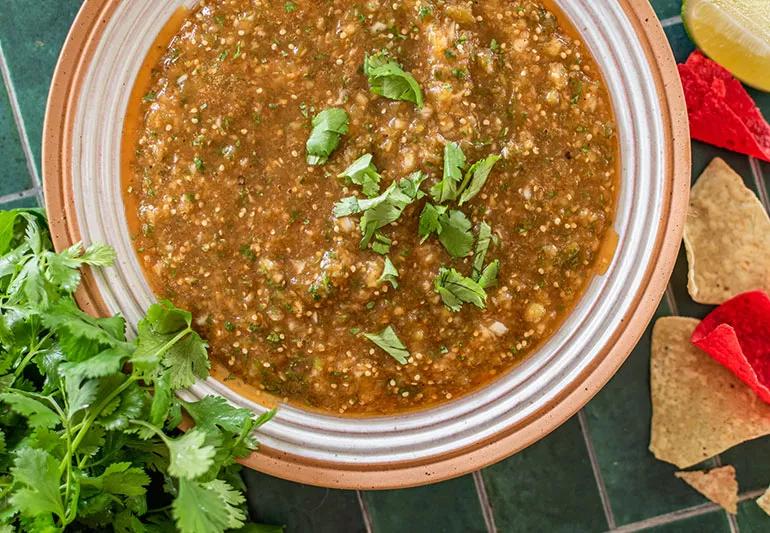 Serve this beautiful green salsa the next time you gather friends and family to watch the game! Tomatillos, which resemble green tomatoes, have a thin, parchment-like husk that you remove before boiling. It’s a refreshing change from red tomato salsa that has a smoky, fresh fragrant aroma and taste!