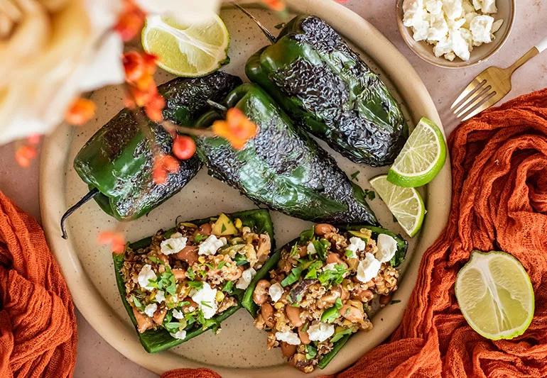 If you’re craving a mildly spicy, veggie-packed dish, then these poblano peppers will do just the trick! Roasted to perfection and stuffed with nutritious favorites — mushrooms, zucchini, corn, quinoa and pinto beans — this dish will fill you with satisfaction and a whole lot of fiber, essential vitamins and minerals and energy-boosting carbohydrates.