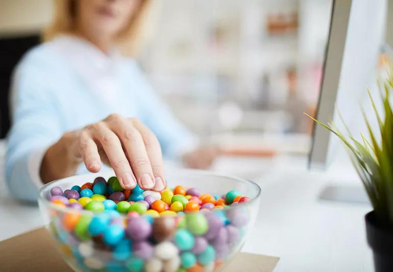 The easiest way to avoid the temptation of free treats is to keep them out of sight.