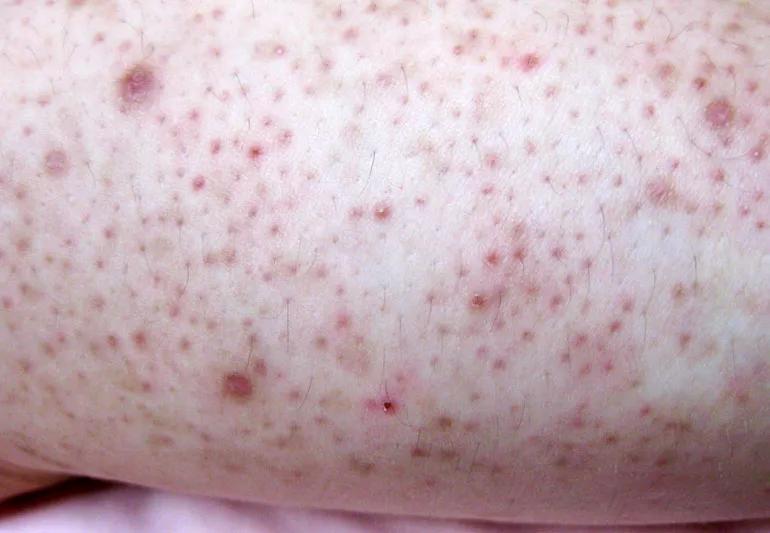 The bumps can be skin-colored or shades of white, brown or red. These splotchy spots most often form on your upper arms. But they can show up in other areas of your body, too, including your thighs and face.