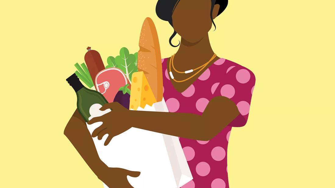 A person carrying a grocery bag full of ingredients like vegetables, cheese and meat