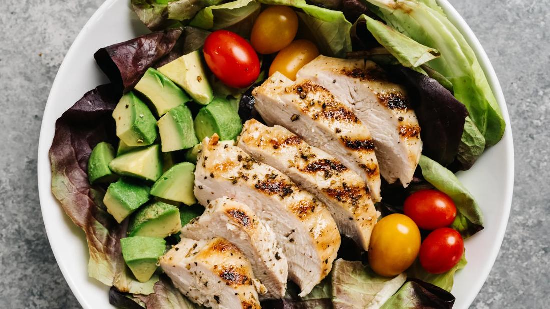 Sliced grilled chicken on greens, with avocado and tomatoes