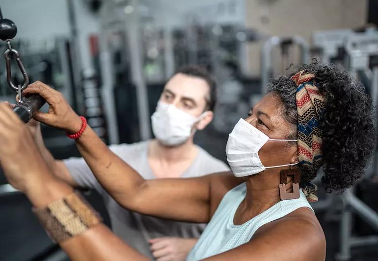 “I wear a face shield, a mask and gloves. We wipe down everything that someone uses — hand weights, parallel bars — we clean everything thoroughly. We have a lot of space so we’re not on top of each other and we’re still maintaining physical distance. We even have separate areas for checking people in and checking out. Initially, some people were uncertain about coming in, but we’re seeing less and less of that now. I think people are more confident and they’re more comfortable wearing masks during their sessions.”